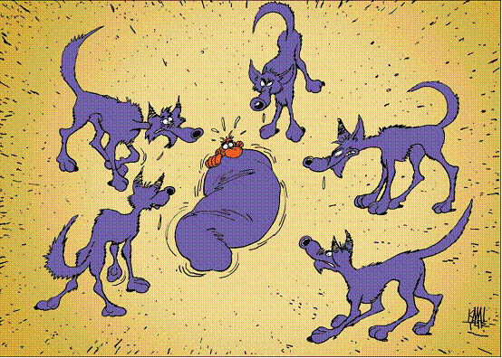 «Τι θέλετε λοιπόν να κάνετε;» τα ρωτάω, προσπαθώντας ταυτόχρονα να σηκωθώ, μα χωρίς επιτυχία αφού δύο νεαρά τσακάλια έχουν μπήξει τα δόντια τους στην πλάτη του γιλέκου μου. Αναγκάζομαι να ξανακάτσω. «Σε προστατεύουν», μου εξηγεί χαμηλόφωνα το γέρικο τσακάλι, «είναι δείγμα αποδοχής και σεβασμού». «Να με αφήσουν τώρα αμέσως!», λέω υψώνοντας τη φωνή μου, και κοιτάζοντας μια αυτόν και μια τους νέους. «Θα σε αφήσουν, φυσικά» μου απαντάει, «αν το θέλεις τόσο πολύ. Ομως θα πρέπει να περιμένεις λίγο, γιατί έχουν δαγκώσει πολύ βαθιά και δεν μπορούν να χαλαρώσουν τα σαγόνια τους παρά μόνο σιγά σιγά. Περιμένοντας, άκουσε την προσευχή μας». «Η συμπεριφορά σας δεν μου δίνει τόσο την όρεξη να κάνω κάτι τέτοιο», του απαντώ. «Μη μας καταλογίζεις τη μιζέρια μας», μου λέει γρυλίζοντας για πρώτη φορά με την πραγματική φωνή του, «είμαστε φτωχά ζωντανά, δεν έχουμε τίποτε άλλο από τα δόντια μας. Για ό,τι θελήσουμε να κάνουμε, καλό ή κακό, έχουμε μόνο αυτά τα δόντια». «Λοιπόν, τι θέλεις;», τον ρωτάω ακόμη κάπως ενοχλημένος.